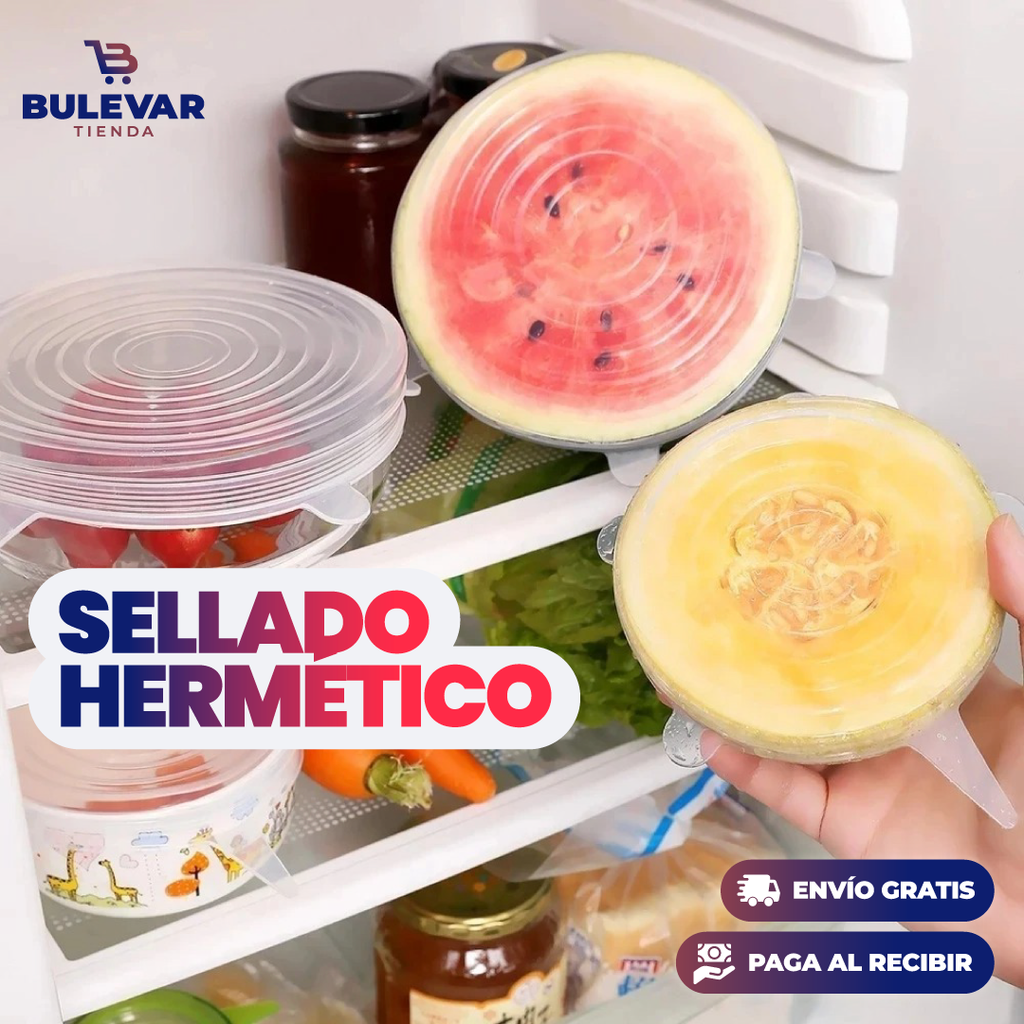 Descubre la solución para conservar tus alimentos de manera eficiente con nuestro Set de 6 Tapas de Silicona. Un sellado hermético que mantiene la frescura por más tiempo.